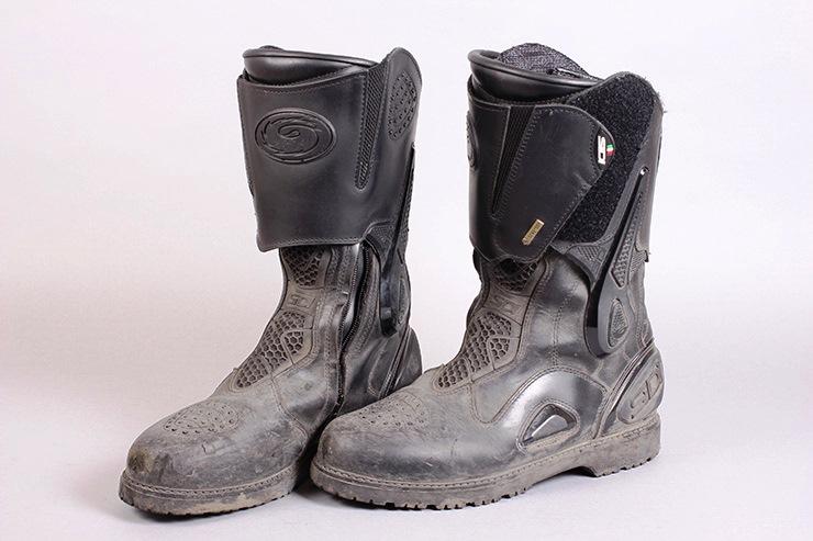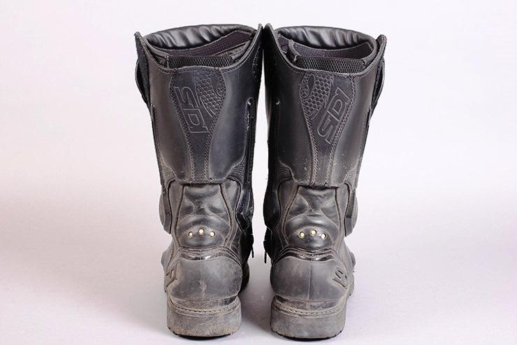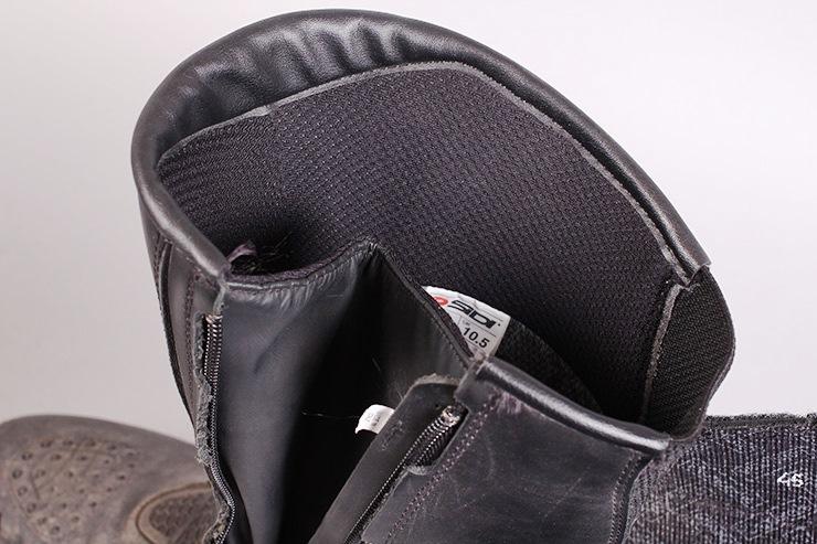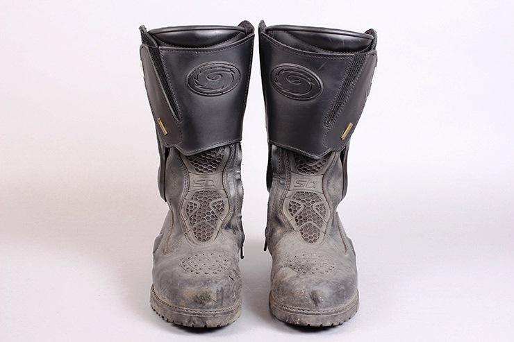 Кожа покрыта мембранным слоем Gore Tex. Ботинки Sidi Armada чуть более громоздкие, чем мои летние Sidi B2, а подошва намного более рельефная, напоминающая туристические ботинки. Небольшие пластиковые защитные элементы расположены на пятках, икрах и взъёмах стоп. На носках слайдеров нет, а голенище защищено двумя слоями мягкой защиты вместо обычного жёсткого пластика.