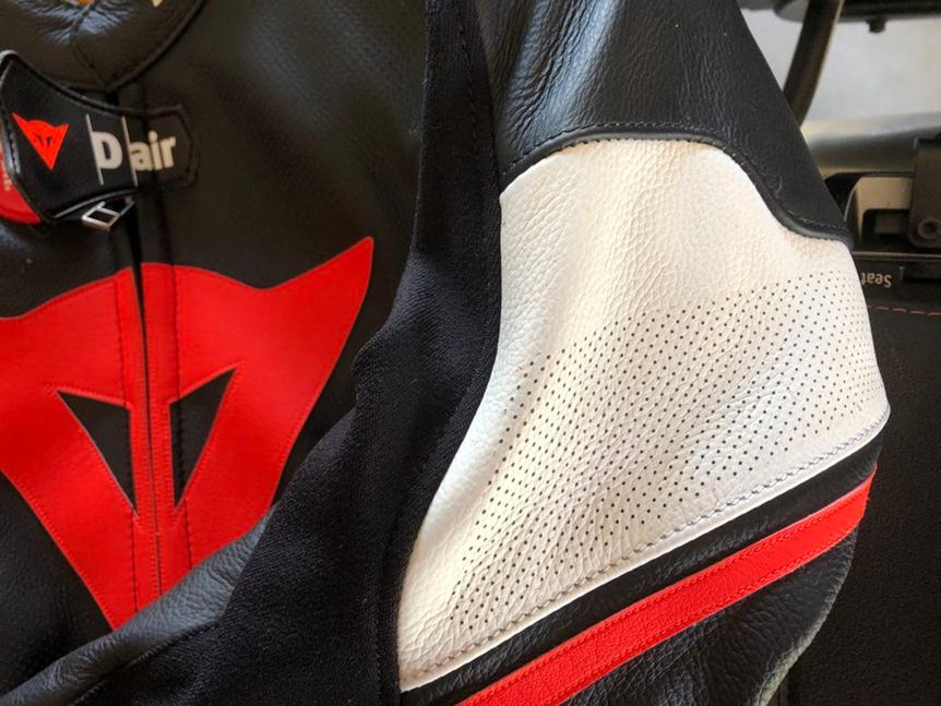 Мотокомбинезон Dainese Misano 2 D-Air превосходно подходит для трека, и это чувствуется сразу: с посадки. В него вшиты небольшие эластичные участки от локтя до запястья и от проймы к лодыжке, обеспечивающие свободу движения при смене позы. Эластичные кожаные элементы за плечами, снизу спины и над коленями обеспечивают гибкость в зонах повышенного риска, где кожу нельзя заменить на более эластичные материалы.