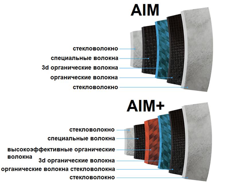 Эти скорлупы созданы из нескольких слоёв различных проприетарных волокон. Скорлупа AIM имеет 5 слоёв: внутренний из стекловолокна, за ним - специальные волокна, затем трёхмерные органические волокна, просто органические волокна, и наконец - внешний слой из стекловолокна. AIM+ обладает шестым слоём высокопрочных органических волокон между специальными и трёхмерными органическими. Да, звучит сложно и интересно, и хотелось бы понять, что это значит и как работает.