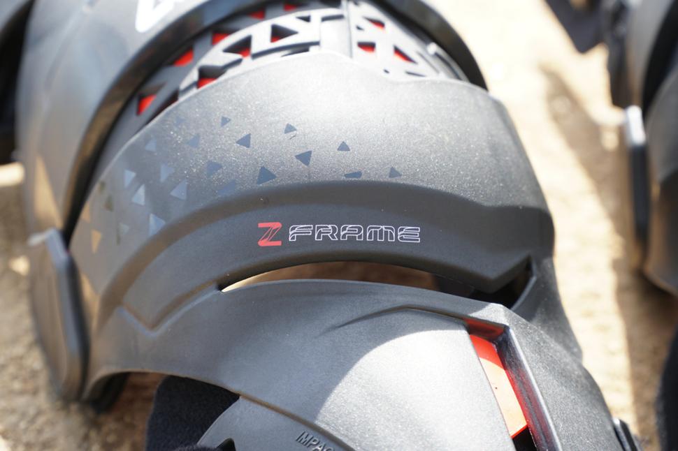 Если верить Leatt, то при разработке новой модели Z-Frame, они учли опыт моделей C-Frame и X-Frame. Основа брейсов вместо углеволокна изготовлена из стеклонейлона с усилением некоторых зон карбоном. Это сделано с целью уменьшения цены. Основа состоит из трех секций: пластины, защищающие бедро, голень и коленную чашечку. Секции наколенника соединяются двумя простыми двухосными шарнирами, расположенными с двух сторон от колена. Шарниры представляют собой абсолютно закрытую конструкцию, вряд ли их можно отремонтировать.