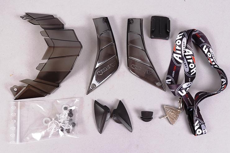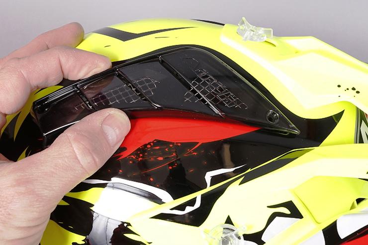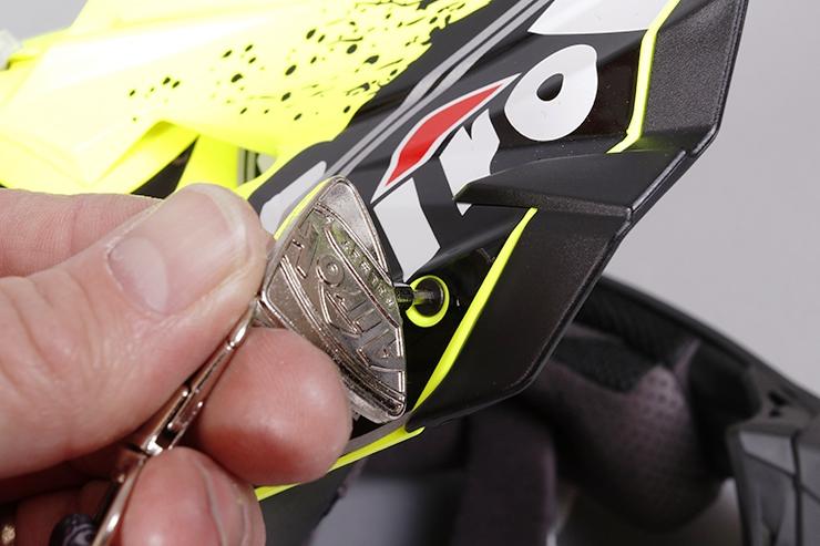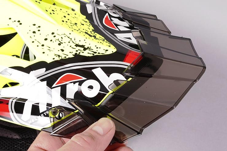 Прорезь достаточно широкая, так что кроссовые или горнолыжные очки легко войдут в неё. По бокам от неё находятся небольшие впадины для резинки очков, а сзади её удерживает от соскальзывания отлив вентиляции. Козырёк снимается без инструментов и оснащён небольшой насадкой, которую можно снять при помощи того же ключа, что и для заглушек вентиляции, и заменить на более длинную насадку с затемнением, тоже входящую в комплект.