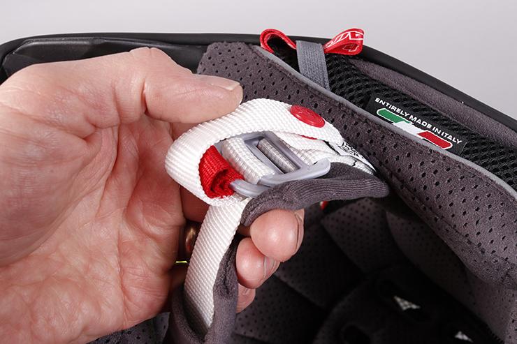 Простая и надёжная конструкция с двумя D-образными пряжками и небольшой кнопкой, удерживающей конец ремешка. Ремешок Airoh Aviator 2.2, пожалуй, чуть коротковат - едва достаёт до кнопки в затянутом состоянии.
