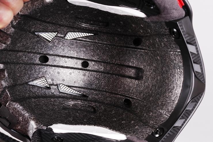 Как я уже говорил, при хорошей езде в таком шлеме жарко бывает даже зимой, поэтому съёмный подклад с возможностью постирать его - просто необходимость. Здесь он выполнен из гипоаллергенных материалов и снимается в считанные секунды, а защёлкивается на место лишь чуточку дольше. Я свой подклад просто стираю в стиральной машинке на 40 градусах.