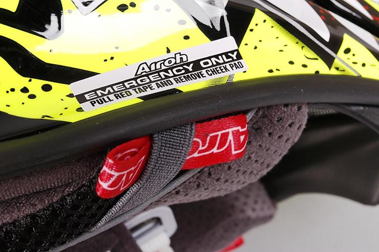 Подклад шлема Airoh Aviator 2.2 имеет систему быстрого съёма на случай аварии: потянув за специальные красные ленты, можно вытащить щёчные подушки, что позволит намного легче снять шлем, не тревожа шею. Не знаю, стоит ли называть эту конструкцию полезной - пусть она лучше будет, но не пригодится, чем наоборот.