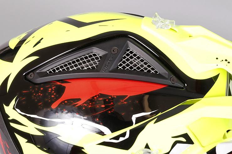 Воздухозаборник со встроенным фильтром спереди рта впускает воздух и отсекает грязь и камни. Ещё три заборника находятся в районе лба и два - на самом верху шлема, а на задней поверхности - выходные щели. Они лишены шторок-защёлок, но в комплект шлема входят резиновые заглушки для тех воздухозаборников, которые расположены на лбу, а для верхних окошек есть ещё и заглушки с частичным пропусканием, крепящиеся при помощи болтов (ключ для которых тоже входит в комплект). Только не совсем понятно, зачем они нужны: при хорошей внедорожной езде даже зимой бывает жарко, так что хороший обдув в Airoh Aviator 2.2 только радует.