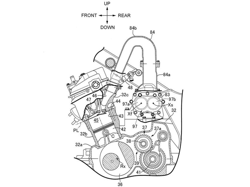 Также патенты Honda демонстрируют, что инженеры не отказались от необычной двойной конструкции аирбокса, в котором два одинаковых фильтра расположены по бокам мотоцикла. Но вместо подачи воздуха непосредственно в дроссель, из левой стороны аирбокса выходит патрубок, подающий воздух в суперчарджер, который его сжимает перед подачей в прямые впускные каналы, ведущие в свою очередь к дроссельным заслонкам.
