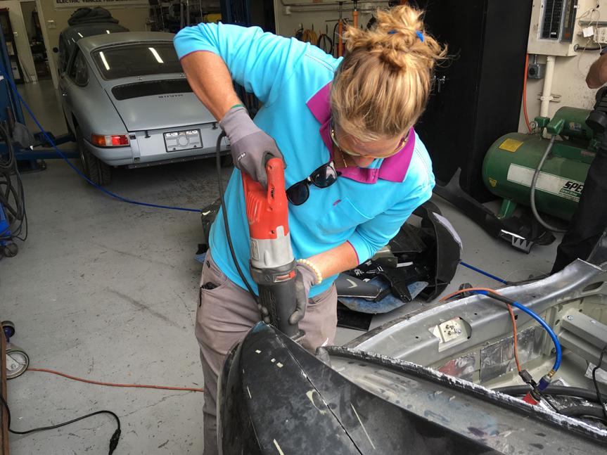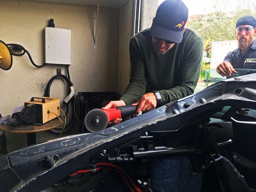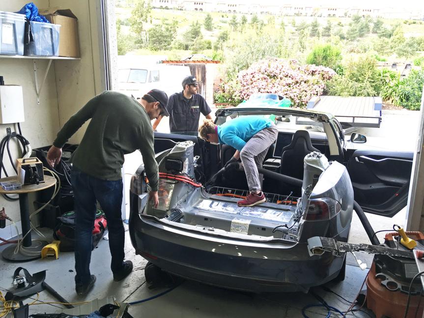По роду деятельности EV West скупает автомобили Tesla на запчасти (с них они берут батареи и другие компоненты), так что на складе компании имелось некоторое количество этих аппаратов. И в общем так вышло, что Брим с друзьями взяли болгарку, выбрали рабочий экземпляр Model S и принялись отрезать кусок за куском.