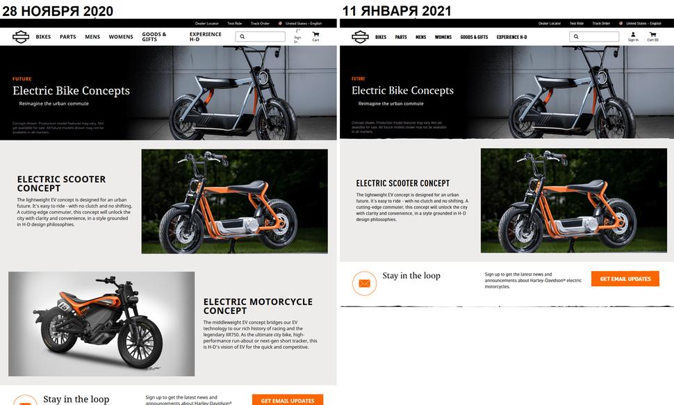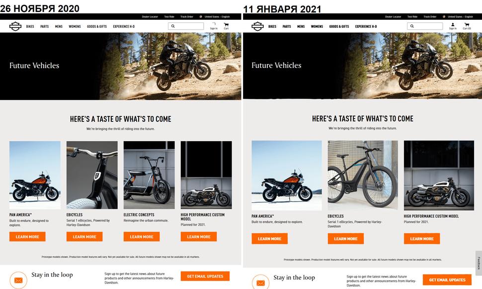 На странице Перспективные Модели (Future Vehicles по-английски) Harley публикуют предстоящие продукты. Содержание этой страницы зависит от рынка (т.е. от выбора страны и языка), но до недавнего времени "основная" версия - то есть на английском языке для Соединённых Штатов - радовала глаз мотоциклом Pan America, электровелосипедом Serial 1, некоей Высокопроизводительной кастом-моделью и концептами электрических мотоциклов Harley Davidson. Прошлым летом из Перспективных моделей уже убрали стритфайтер Bronx, а на днях отсюда исчезли и электроконцепты. Причём сама страничка, на которой они ещё недавно отображались, осталась, но теперь на ней красуется только концепт электроскутера.