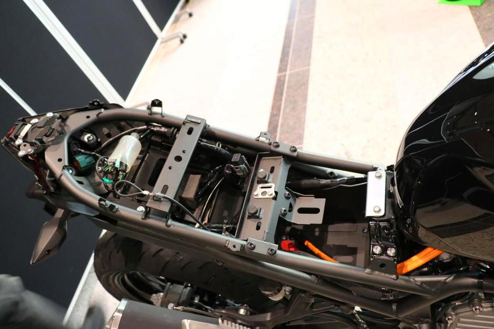 Двигатель установлен в новой, специально разработанной трубчатой стальной раме, оснащённой большим электромотором, установленным над трансмиссией. В городском режиме мотоцикл может переходить на электротягу, отключая ДВС. Учитывая, что всё больше крупных городов по всему миру вводят зоны нулевых выбросов (где разрешено движение только на электротяге или водороде), это довольно актуально сейчас и является хорошей заделкой на будущее. Более того, этот процесс может происходить автоматически - при помощи GPS-приёмника, что обезопасит райдеров от штрафов за езду на бензиновом приводе внутри границ зелёных зон.
