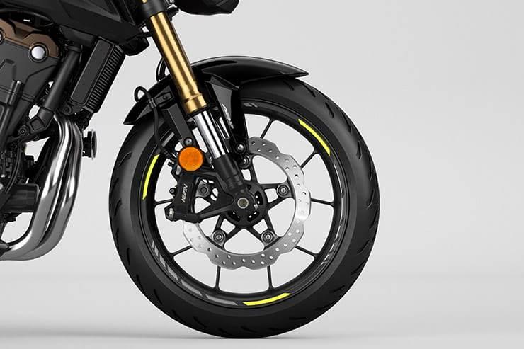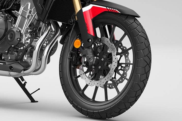 К обновлению вилки конструкторы решили приурочить и доработку тормозной системы: переднее колесо всех трёх Honda CB500 2022 года наконец-то получило два тормозных диска вместо однодискового контура прошлых версий. На CB500F и CBR500R диски теперь 296-миллиметровые вместо одного 320-го, а установлены на них радиальные двухпоршневые суппорты Nissin вместо суппортов с обычным креплением. CB500X получила аналогичную пару 296-миллиметровых дисков на замену 310-миллиметровому диску прошлых лет, но двухпоршневые суппорта Nissin здесь установлены обычным образом. Тем не менее, суппортов и дисков стало больше, так что производительность и информативность тормозной системы CB500X существенно возрастёт.