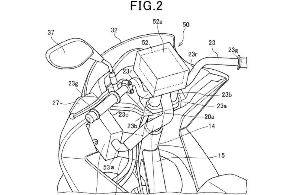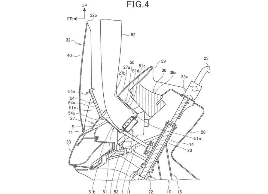 Во втором варианте воздушная подушка установлена ещё дальше от райдера, позади приборной панели - прямо под ветровым стеклом скутера. Вопрос с раскрытием подушки строго вверх (а не в лицо райдеру) Honda и решила защитить патентом: при срабатывании аирбэга ветровое стекло откидывается вперёд.