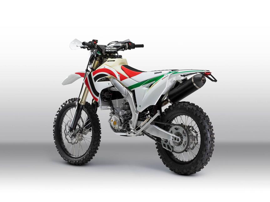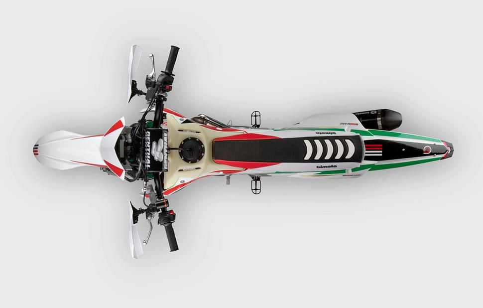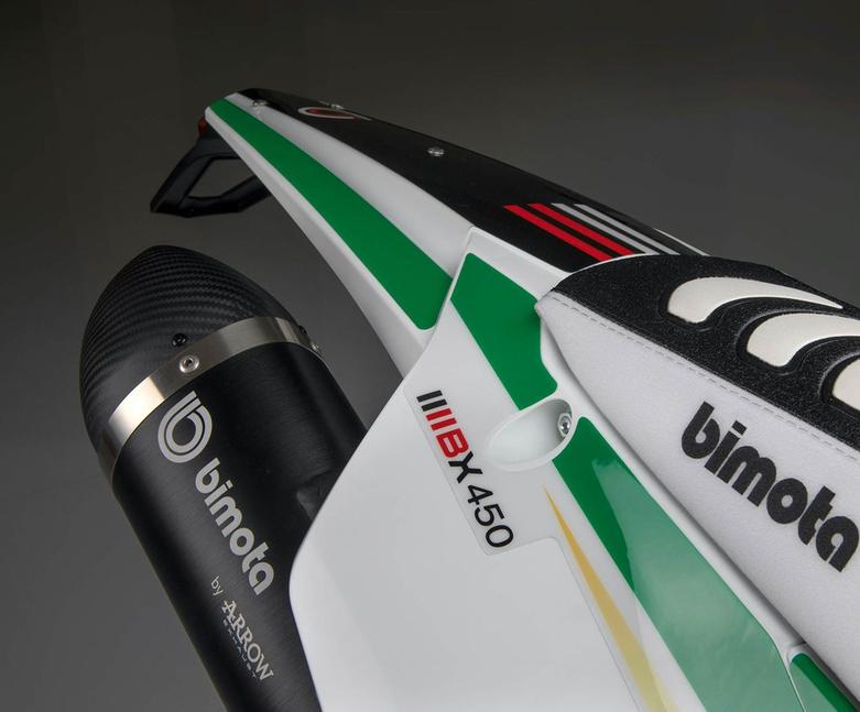Из-за дополнительных компонентов Bimota BX450 весит 110кг с пустым баком - это почти на 4кг больше, чем KX450X. Облицовка конструктивно та же, что и у Kawasaki, только облачённая в итальянские цвета, а соответствующий Euro 5 глушитель Arrow имеет карбоновую отделку выходной части.