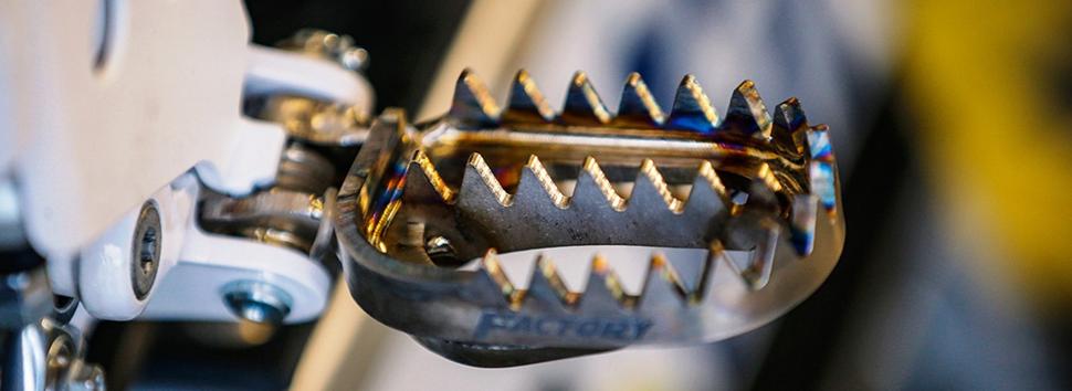 Грэму нравится педаль заднего тормоза от Enduro Engineering с защитной шлейкой. Эта педаль мягче, чем стандартная, так что она скорей согнётся, чем заблокирует колесо при ударе. Подножки у нас от Raptor. Это мощные титановые подножки, установленные на 10 мм дальше и на 10 мм ниже, чем стандартные.