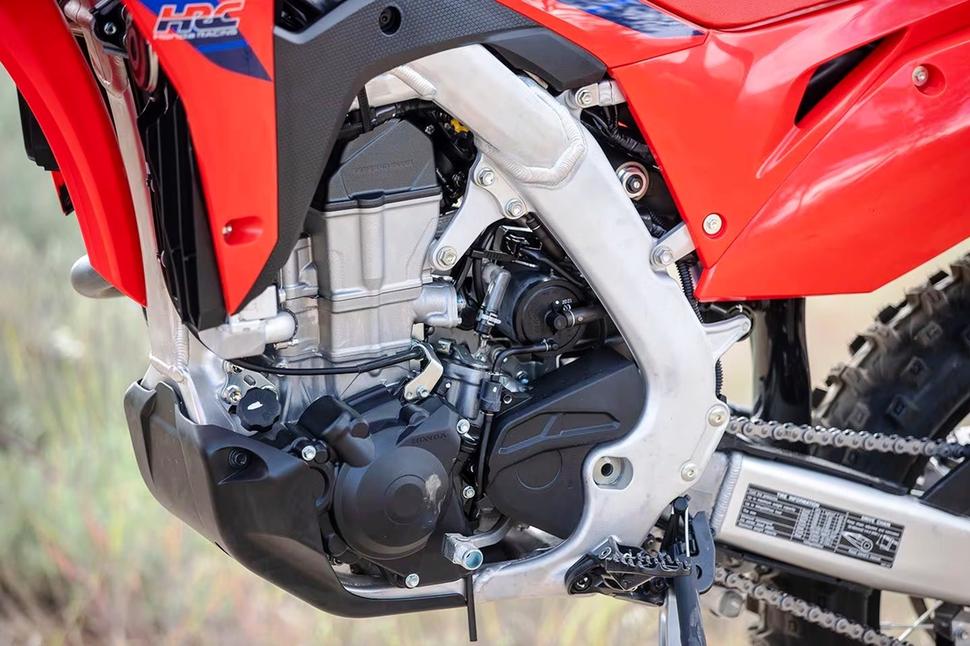На диностенде Honda CRF450RL показала достаточно скромные 38,0лс на 7500об/мин и 37,7Нм на 6400об/мин. Для сравнения, KTM 500 EXC-F 23 года выдаёт 40,5лс на 8200 и 38,8Нм на 7000об/мин, а кроссовая CRF с тем же мотором, что и у RL, выдаёт аж 52,5лс на 9100об/мин и 47,6Нм на 6600об/мин. То есть, в дуал-спортовом виде мотор хорошо так дефорсирован, но тем не менее, даже в горной местности он отлично тянет и прекрасно откликается, легко задирая переднее колесо для заезда на высокие неровности, и срывая заднее для поворота. Линейная характеристика и мощные средние обороты позволяют отлично дозировать тягу, хотя 133кг снаряжённой массы - это немало по меркам внедорожных мотоциклов.
