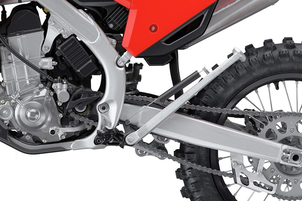 Подробности довольно весомы: более узкая рама Honda CRF450RX весит на 700 граммов меньше, а подрамник - на 320 граммов. Торсионная жёсткость шасси не изменилась, а осевая уменьшилась на 20% для увеличения скорости руления, сцепления с поверхностью и точности управления, по словам Honda. Алюминиевый маятник также был изменён с позиций жёсткости под стать новой раме - он более узкий, а точка размещения оси и характеристика рычага подвески Pro-Link изменены.