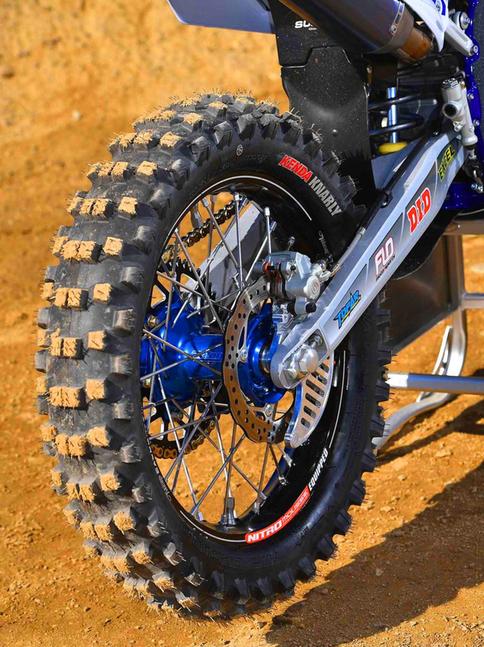 Свой держак Уэбб доверяет Kenda Knarly 140/80-18 сзади - признавая, что "большинство европейцев ездят на 140-й, на более широкой, я думаю, и держак получше". Передняя - Kenda Washougal III 80/100-21, которая немного побольше, чем предыдущая версия, и очень нравится Коди. Внутри - муссы от Nitro Mousse (с мягким NMS18-305 сзади), а установлены шины на колёсы от Dubya на их синих анодированных ступицах с ободами Takasago Excel A60. "Предсказуемость Nitro Mousse, основанная на их консистенции, очень приятна."