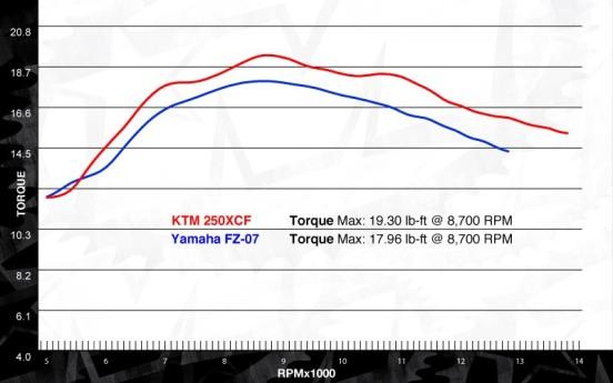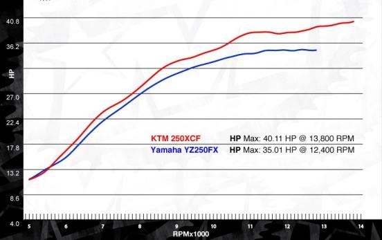 В заводской комплектации крутящий момент KTM значительно выше. На максимальных оборотах мы заметили существенную разницу между двумя моделями. На 11500 оборотов Yamaha выдаёт мощность в 35, а KTM – 38,5. Затем производительность двигателя Yamaha снижается, в то время как KTM способен наращивать обороты до 13500 и выжать 40 лошадей, т.е. он превышает пиковую мощность Yamaha YZ250FX на пять единиц.