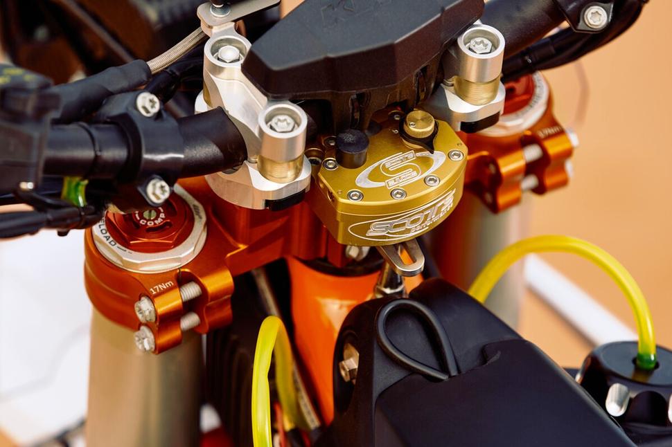 Мотоцикл оснащён тремя бензобаками, два из которых расположены спереди и один сзади. Общая ёмкость их составляет около 34,5 литров. 48-миллиметровая вилка WP XACT PRO 7548 от WP Pro Components с закрытыми картриджами и коническими клапанами установлена в траверсах со смещением 23мм, изготовленных на станке с ЧПУ. Верхняя траверса оснащена системой демпфирования собственной разработки с рулевым демпфером от Scotts для устойчивости на высоких скоростях. Сзади имеется литой маятник с полностью регулируемым амортизатором WP XACT Pro 7750.