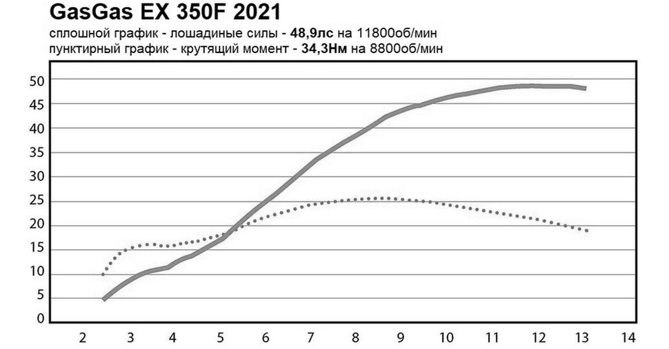 На диностенде GasGas EX 350F 2021, заднее колесо которого было обуто в дорожный Dunlop, в пике показал 48,9лс на 11800об/мин и 34,3Нм на 8800об/мин. Для сравнения, пиковая мощность GasGas EX 350F 2021 оказалась на 0,2лс меньше, чем пик Husqvarna FX 350 2020, достигнутый на 11700об/мин - разумеется, такая небольшая разница говорит скорей об идентичности, чем о различии конструкции силовых агрегатов двух мотоциклов.