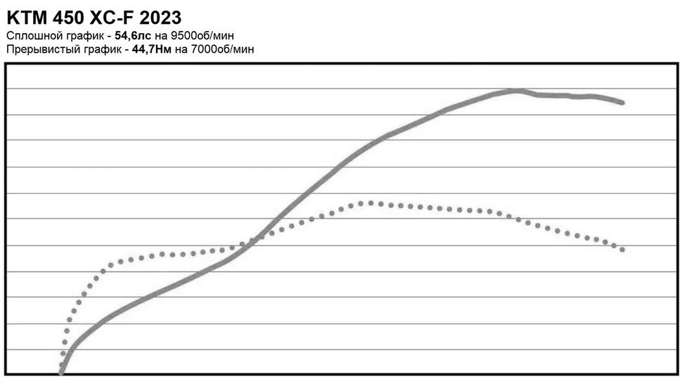 KTM 450 XC-F 2023 года, в соответствии со слоганом компании, в полной готовности к гонке был водружён на весы, показав массу в 111,6кг. Это на 2,7кг больше, чем весила модель прошлого поколения (2019-2022 годов). На диностенде топовый KTM 450 XC-F 2023 произвёл пиковые 54,6лс на 9500об/мин и 44,7Нм на 7000об/мин. В цифрах результаты модели 2023 года на 2,5лс больше, но на 1Нм меньше, чем у предыдущей версии, ну а уж насколько эти отличия важны в действительности - покажет трасса.