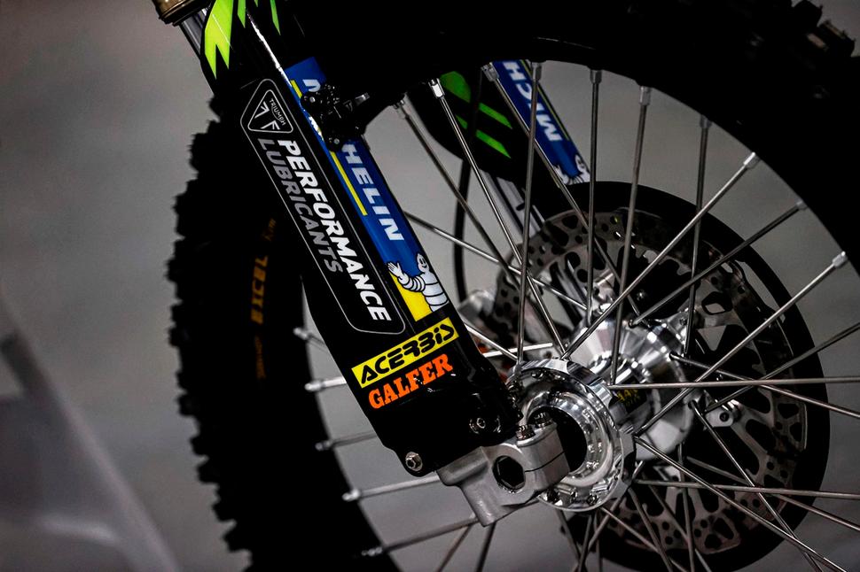 Ещё на мотоцикле Уокера имеются такие приятные мелочи, как крышка сцепления Hinson, более прочная, чем стандартная, подножки Raptor Titanium установлены на 5мм ниже и 5мм дальше назад, полный выхлоп Akrapovic - официальный компонент из каталога Triumph, причём немного не такой, как для кроссовой версии, так что, похоже, разработанный специально для эндуро. Тормозные диски - от Galfer, спонсора, который пришёл от Beta вместе с Джонни, причём Джонни продолжает использовать цельный задний диск, и оба диска имеют стандартные размеры. Колёса обуты в шины Michelin с муссами, и на этом в принципе всё.