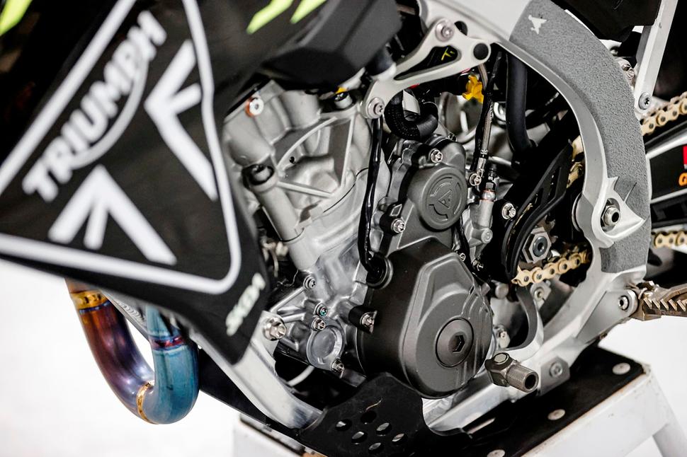 Мотоцикл заводской команды обычно чуть отличается от серийной версии из магазина, и в мотоцикле Уокера установлены внутренние элементы K-Tech в компонентах от KYB. Основная часть процесса настройки мотоцикла для Джонни состояла в поиске правильного баланса подвесок и их настройке спецами K-Tech под специфические условия эндуро в закрытом помещении. По словам Джонни, траверсы X-Trig ему интересны, потому что в прошлых сезонах (в команде Beta) он с ними не был знаком. Он заметил, что Triumph с траверсами X-Trig дают бОльшую гибкость и информативность, а переднее колесо с ними меньше подламывается в поворотах.