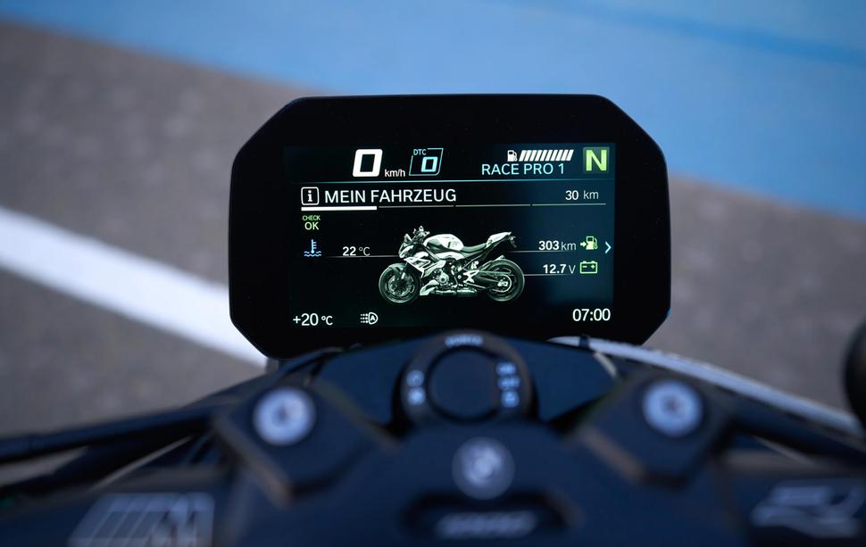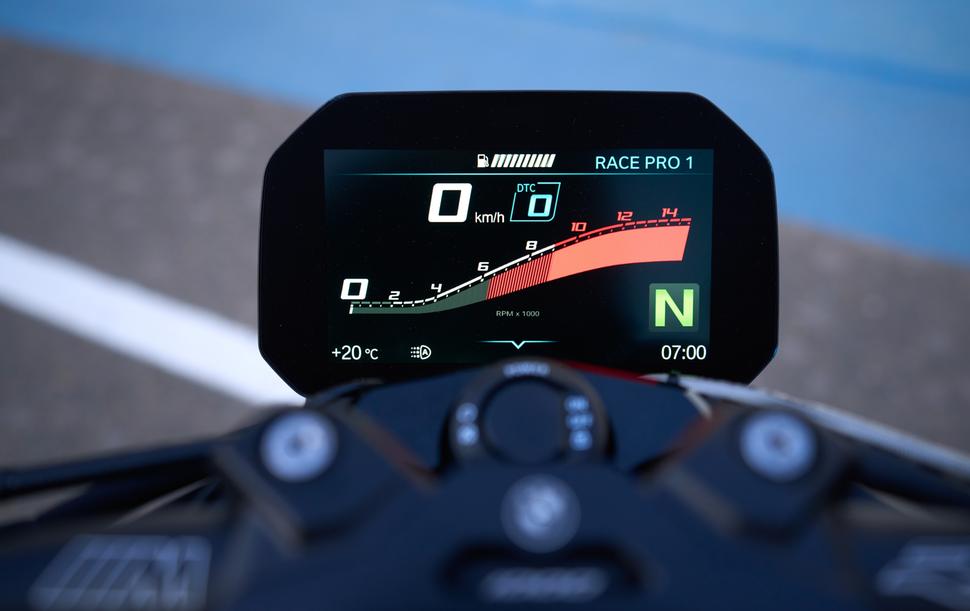 Новый BMW M 1000 R в базовой комплектации оснащён системой помощи на склоне Hill Start Control Pro. Её возможности превосходят стандартную (не Pro) версию благодаря автоматическому режиму работы. Меню настроек позволяет индивидуализировать эту функцию таким образом, чтобы удерживающий тормоз автоматически активировался при уклоне более +- 5%, когда выжат рычаг ручного или ножного тормоза вскоре после остановки.