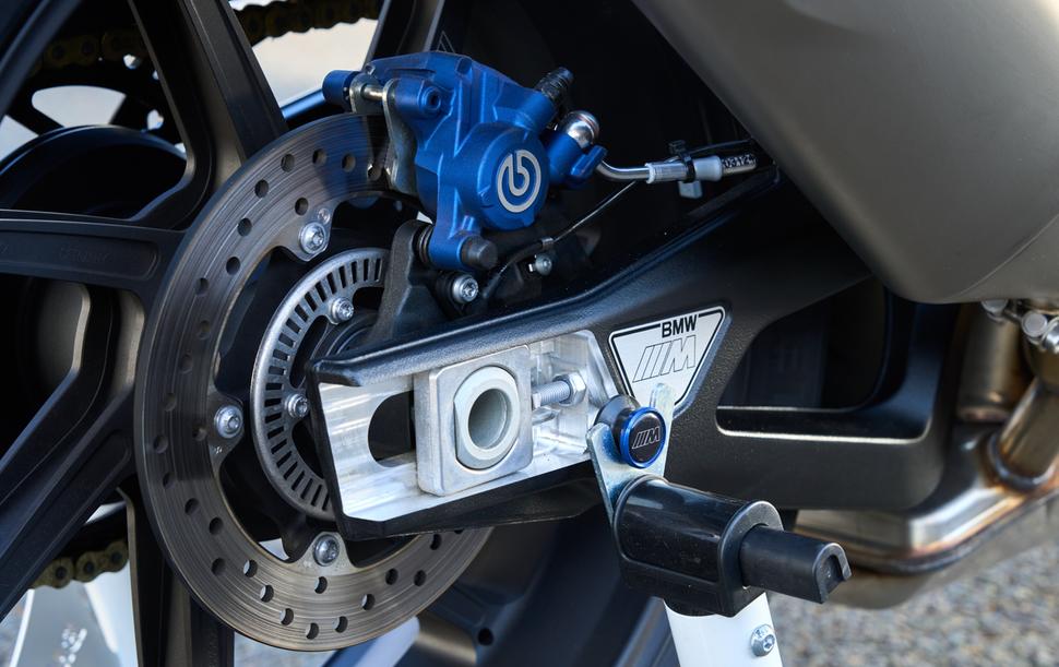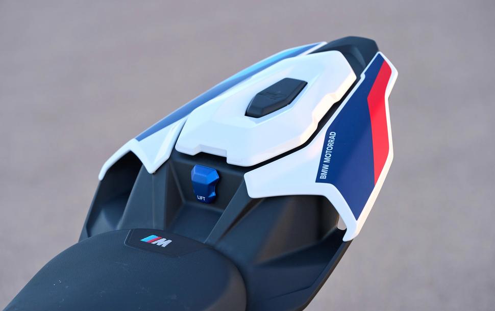 Укороченный и лёгкий кронштейн номерного знака образует единое целое с подсветкой номера и задними указателями поворота, также выступающими задним фонарём и стоп-сигналом. Эта чрезвычайно компактная конструкция позволяет подготовить BMW M 1000 R к гонкам буквально за пару шагов.