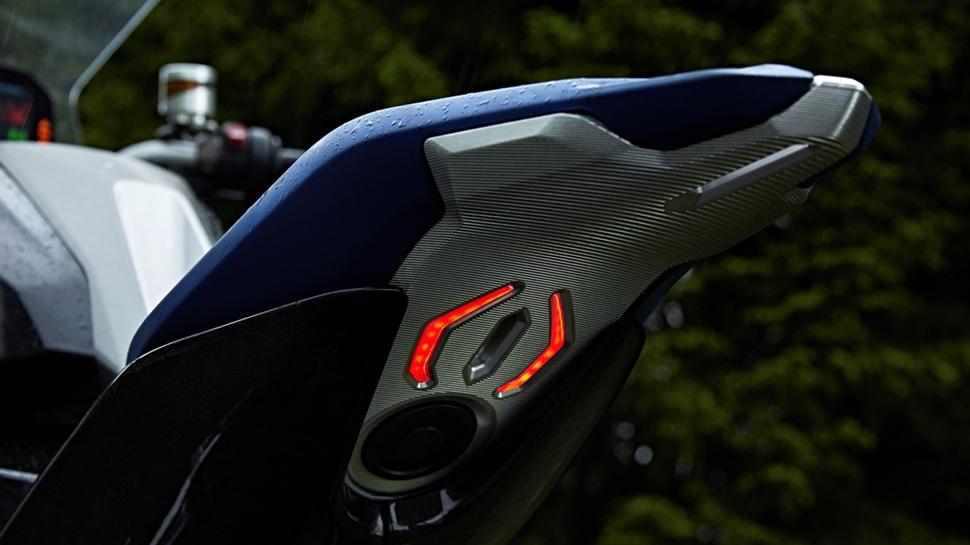 Да, мотоцикл BMW 9cento имеет спортивный вид. Ну а как же пассажир? Система сидельных сумок BMW 9cento (крепится с помощью электромагнита) незаметно интегрируется в общий вид мотоцикла. Они вам пригодятся в путешествии с другом, хотя выглядят они довольно маленькими и без второго сиденья. Маловероятно, что райдеры из США найдут их полезными. Второе сиденье не внушает уверенности в своем удобстве для дальних путешествий. Задние фонари очень красиво установлены под сиденьем, но, скорее всего, они не соответствуют законодательству.