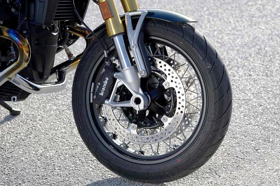 Два 310-х передних диска с четырёхпоршневыми моноблочными суппортами Brembo дают мощное торможение с чётким, но не резким начальным закусом. По мере выжима рычага связь с передней шиной только растёт, внушая уверенность и позволяя немного глубже заходить в поворот, прежде чем тормозить. Задний 265-миллиметровый диск с двухпоршневым суппортом на нём просто есть, о нём нечего сказать ни хорошего, ни плохого. Вмешательство ABS хорошо выверено и в мокром, и в сухом режимах, и она никогда не вмешивается слишком рано. Даже несмотря на довольно солидный вес R 12 nineT, тормозит он эффективно и чётко.