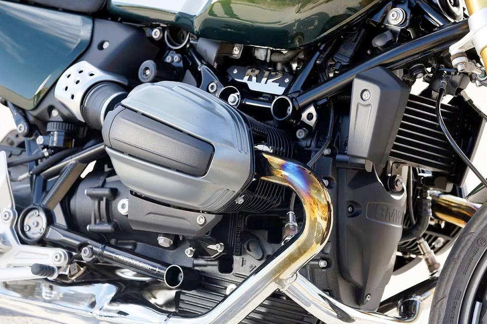 Двигатель BMW R 12 nineT 2024 не изменился - это тот же 1170-кубовый восьмиклапанный двухцилиндровый оппозит воздушно-масляного охлаждения. BMW заявляют те же пиковые 109лс, только приходятся они на более низкие обороты (на 250об/мин ниже). Пиковая тяга составляет 115Нм (это на 1Нм меньше, чем раньше) и приходится на 6500об/мин. Воздушный короб под седлом лишён уже упомянутой впускной воронки, располагавшейся раньше на правой стороне бензобака nineT. Выхлопная система тоже новая и лишена снижающего громкость на малых скоростях клапана. Теперь глушитель с каталитическим конвертером находится под трансмиссией и не нуждается в этом клапане, оканчиваясь двумя выпускными трубами с левой стороны мотоцикла.