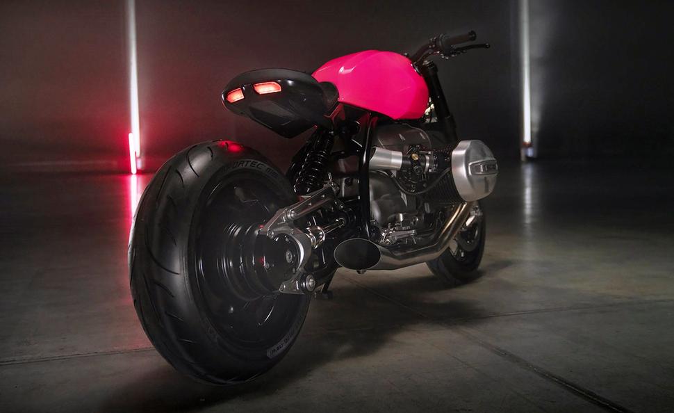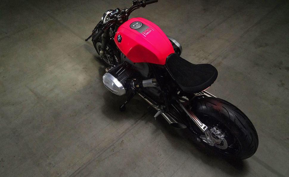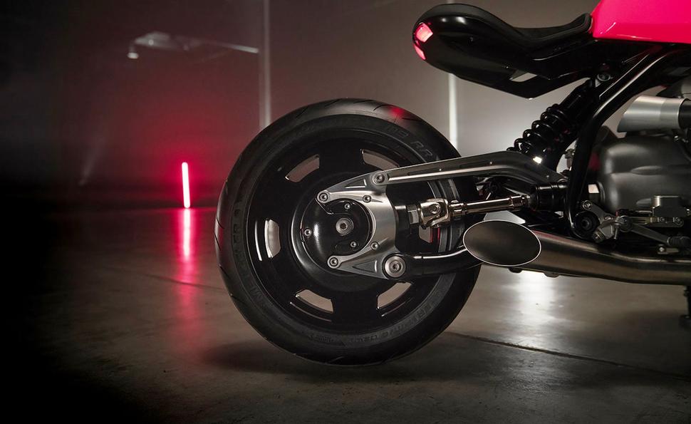 Ярко-розовая окраска бензобака - это явная отсылка к 70-м годам прошлого века. Моделей в конкретно таком цвете у BMW вроде бы не было, в том числе и автомобилей, но выглядит он шикарно. Сиденье обшито искусственной замшей и кожей, а двойной диодный задний фонарь придаёт мотоциклу немного эстетики современных маслкаров. Всё это оттенено полированным алюминием и анодированной бронзы, и выглядит просто шикарно.