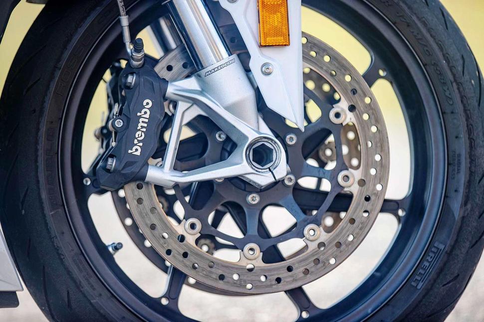 На настроенном мотоцикле даже такие простые вещи, как повседневные поездки по городу или выезд на трассу, становятся лёгким и весёлым занятием. Мотоцикл очень собранный, поворачивает с прецизионной точностью, рулится легко. Сглаживание полуактивных подвесок Marzocchi регулируется прямо на ходу при помощи кнопки на левом пульте. Режим Road (Дорожный), самый мягкий в плане сглаживания, обеспечивает комфортную городскую езду, при которой подвески поглощают любые неровности. Главное, не забывайте, что перед поездкой нужно вручную выставить преднатяг пружин вилки и амортизатора, потому что электроника управляет только сглаживанием. Преднатяг выставляется очень просто, при помощи головки или ключа на 13.
