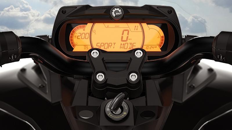 Панель управления напоминает гидроцикл - возможно, это связано с ещё одним брендом материнского предприятия - Ski Doo - и служит местом крепления пары зеркал и небольшого ветровика, защищающего новую 7.6-дюймовую жидкокристаллическую приборную панель. Все важные значения отображаются на этой приборке, и надо сказать, она выполнена хорошо - чётко, понятно и легко читается.