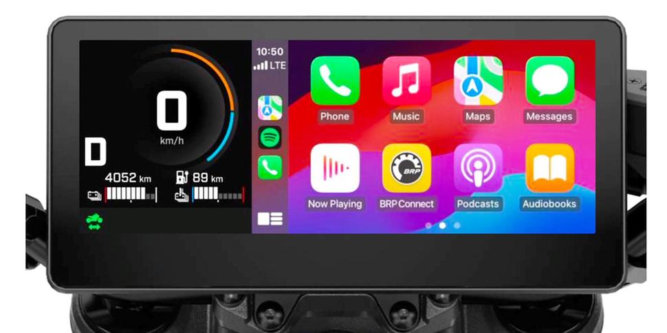 Обе модели оборудованы внушительным 10,25-дюймовым сенсорным дисплеем, совместимым с Apple CarPlay. В том числе он поддерживает навигацию, как дисплеи в современных автомобилях или дорогих вездеходах (например, Can-Am-овских). В обычном режиме дисплей отображает скорость и заряд аккумулятора, при желании раскладку экрана можно настроить.