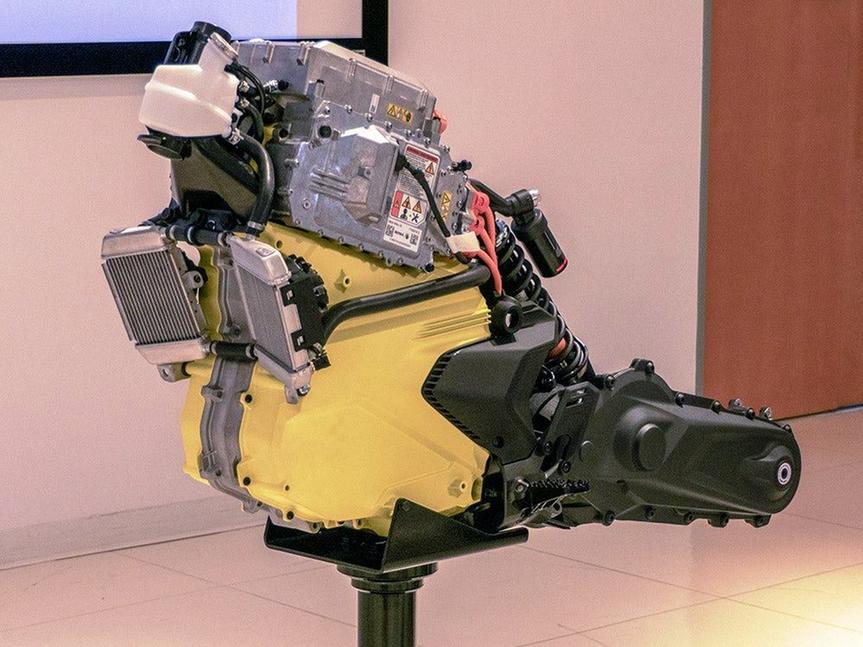 47-сильный электромотор производства Rotax (подразделения BRP), выдаёт вполне реалистичные 72Нм тяги и располагается около оси маятника. Частично он встроен в уникальный односторонний маятник с находящимся внутри цепным приводом на колесо. Также в состав трансмиссии входит простенький редуктор, ни многоступенчатой коробки, ни сцепления здесь нет - именно так обычно устроены электроциклы, да и электроснегоходы тоже. В версии Pulse мотор обладает четырьмя режимами езды: Эко, Нормальный, Дождевой и Спортивный, а на Origin имеется ещё два: Внедорожный и Внедорожный Плюс. Режимы представляют собой определённые сочетания настроек характеристики двигателя (Спортивная, Нормальная и Экономичная), режима ABS (Внедорожный и Асфальтовый), Трекшн-контроля (Внедорожный, Спортивный, Асфальтовый и Дождевой), а также рекуперативного торможения.