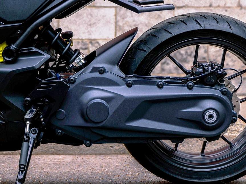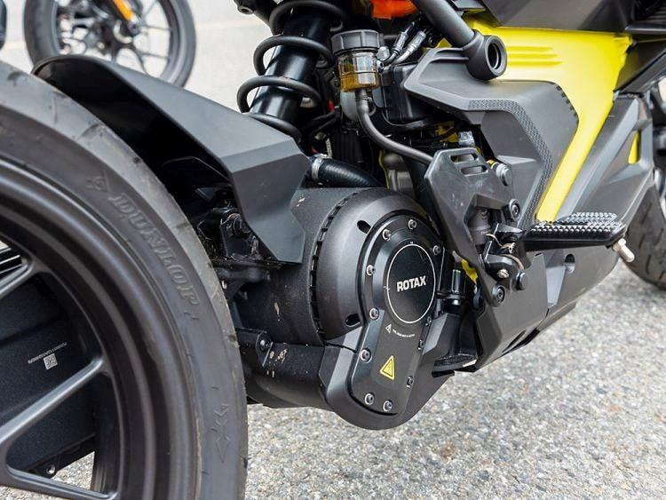 Обе новинки Can-Am основаны на общей архитектуре, названной PowerUnit Core. Она состоит из аккумуляторной сборки на 8,9кВт*ч, небольшого электромотора Rotax и закрытого цепного привода, одновременно представляющего собой односторонний задний маятник. Инвертор постоянного тока в переменный, контроллер мотора и зарядник на 6,6кВт (всё это - отдельные модули) аккуратно прикреплены к корпусу аккумулятора, окрашенному в жёлтый в качестве отсылки к классической расцветке мотоциклов Can-Am.
