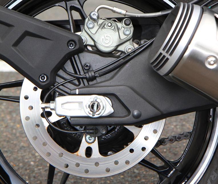 Платформа CFMoto CL-X Sport радикально улучшена в части тормозов - модуль ABS от Continental, радиальные суппорта Brembo M4.30 на двух 320-х дисках с волнистым краем спереди, ГТЦ тоже от Brembo. Сзади двухпоршневой Brembo стоит на 260-м диске. Модуляция и информативность переднего тормоза на высоте, но для того, чтобы использовать весь его потенциал, приходится выжимать рычаг больше чем двумя пальцами.