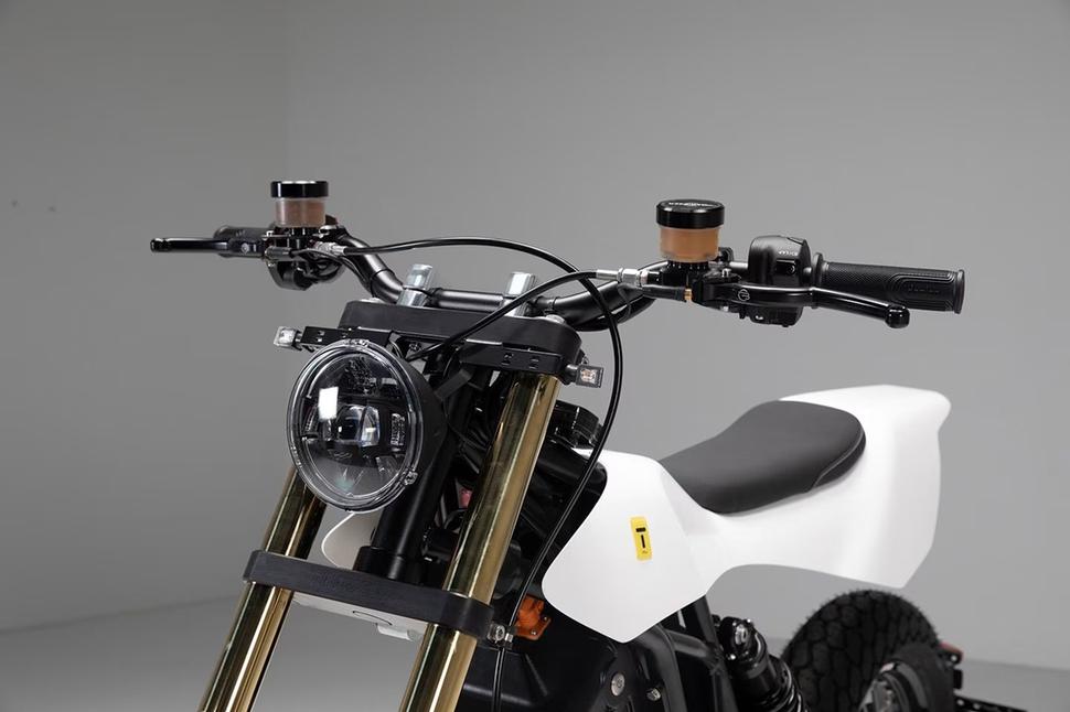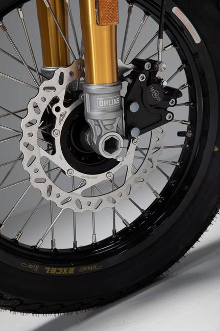 Лёгкие 19-е внедорожные колёса Excel обуты в флэт-трекерную резину от Mitas и оснащены тормозными компонентами Beringer. Информации о ходах подвесок, к сожалению, Trevor не предоставили, зато упомянули, что рама мотоцикла использует технологию Sarolea Performance Technology. Если что, Sarolea - это ещё один бельгийский бренд, пару лет назад представивший гоночный электроцикл SP7 для IOM TT Zero. По данным Trevor, команда Sarolea Performance Technology работали с ними совместно над мотоциклом для обеспечения "тесной интеграции OEM-компонентов премиум-класса".