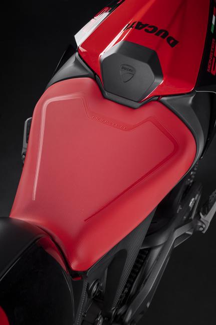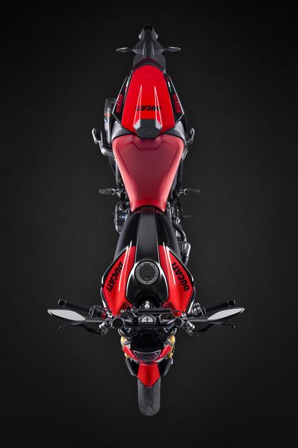 Расцветка версии SP придаёт Ducati Monster более привлекательный и агрессивный характер, а графика в её составе, вдохновлённая MotoGP-шными мотоциклами Desmosedici заводской команды, характеризуется тремя оттенками красного под разными именами, Ducati Red, Racing Red и Amaranth Red, контрастирующими с глянцевым чёрным и подчёркивающими динамичный характер Monster SP. Седло в красной обшивке также напоминает гоночные образцы и придаёт лёгкость хвостовой части, создавая визуальную непрерывность с боковыми панелями того же цвета, украшенными маленьким итальянским флагом с каждой стороны вместе с логотипом Monster SP. Даже надпись Ducati на баке характеризуется более крупным размером, отсылая ко графике Panigale V4.