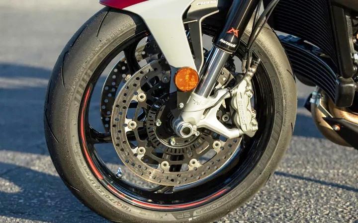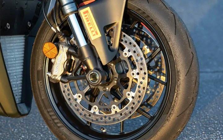 Тормоза Brembo-вские, но не Stylema, как на Triumph или KTM. Тут стоят суппорта попроще, а именно M4.32, но стоит признать, что работают они вполне адекватно. Без прямого сравнения с соперниками тормоза Ducati впечатляют - достаточно одного пальца даже для экстренного торможения, но штука в том, что после хорошего начального закуса они по мере дальнейшего выжима рычага делаются несколько невнятными по сравнению с KTM и Triumph. Возможно, стоит заменить колодки на такие, как у KTM-а.
