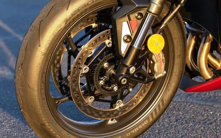 Тормоза Triumph Street Triple 765RS понравились всем четырём тестерам. Немудрено: Brembo Stylema - это великолепные суппорта (хоть их и слегка приглушили мягкими колодками), но главное тут - регулируемый главный цилиндр MCS 19/21. Когда рычаг находится в положении 19-миллиметрового поршня, его информативность великолепна, позволяет уверенно тормозить в повороте до апекса. Каждый миллиметр хода рычага мягко и отчётливо влияет на тормозное усилие. Triumph заслуживает высших оценок за тормоза… но штука в том, что у KTM они ровно такие же.