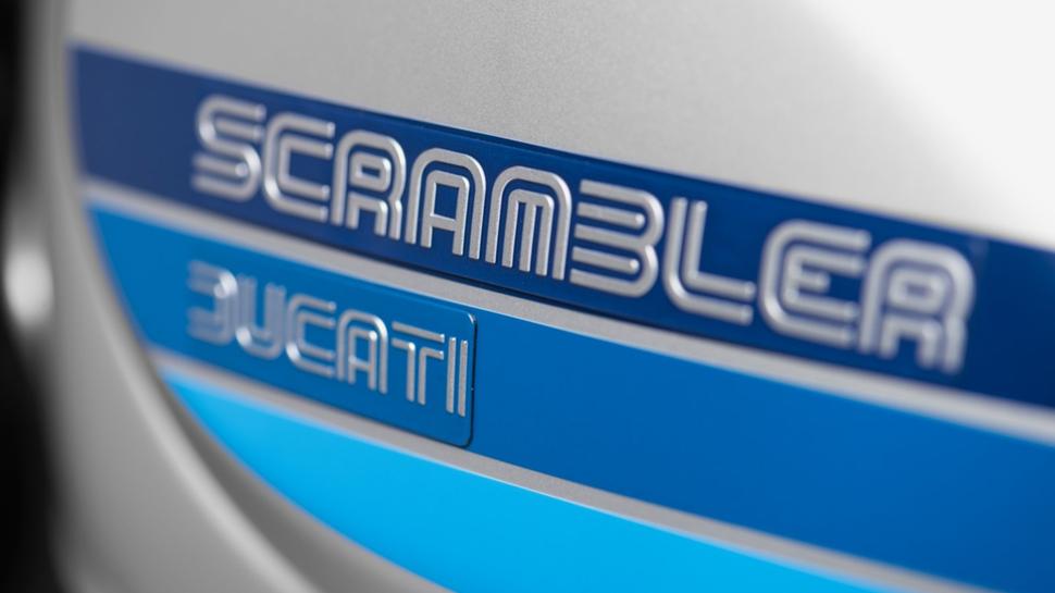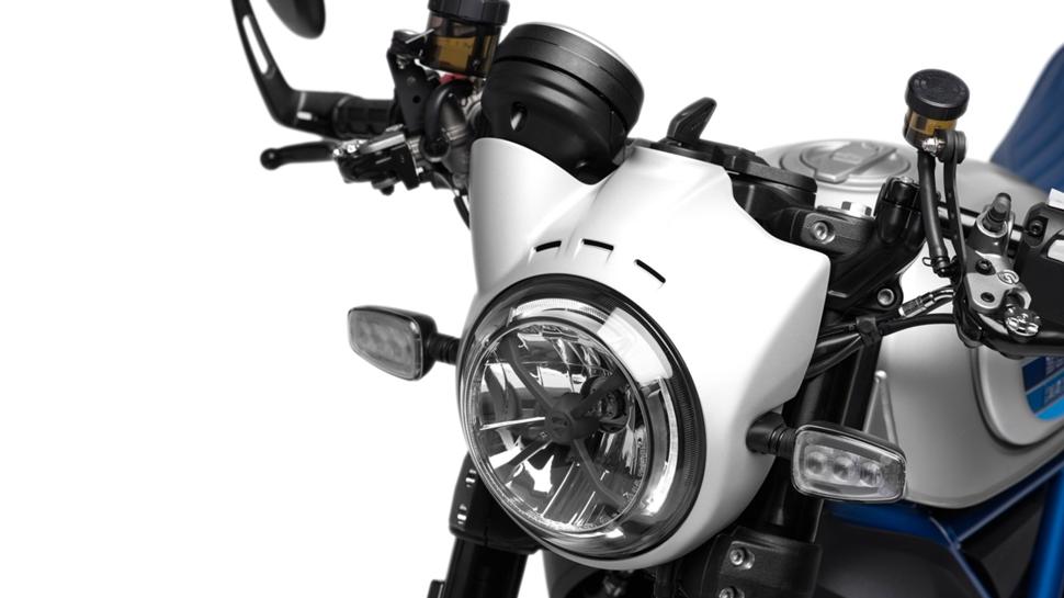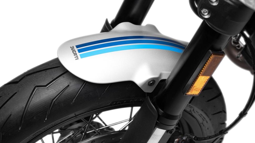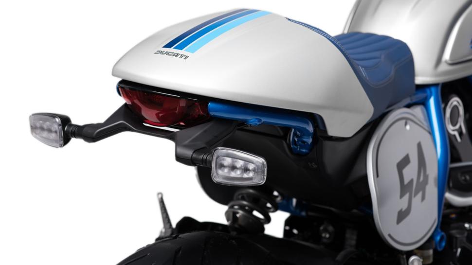 Начнем с новой классной схемы окраски, которую Ducati называет «Silver Ice Matt», и, как чертовски умное название подсказывает, он имеет серебряную окраску на металле, пластике и вообще на всем в сочетании с полосами в стиле семидесятых различных оттенков синего, что хорошо сочетается с цветом рамы. Небольшой обтекатель над светодиодной фарой и хвостовой обтекатель, который на самом деле крышка на пассажирском сидении, создают атмосферный дизайн каферейсера. Номерной знак и зеркала на концах руля напоминают нам эстетику гонок у придорожных кафе и хоть эти детали малозаметны, Ducati более верен жанру, чем все остальные на этом рынке.