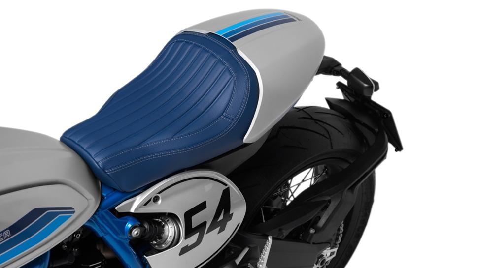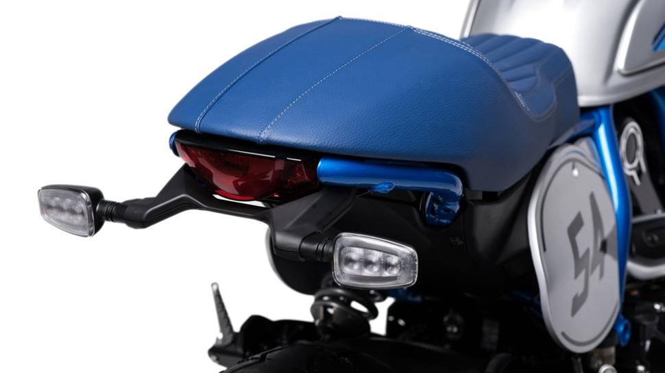 Форма бака создает приятную верхнюю линию, переходящую в синее седло с небольшим подъемом сзади, которое удобно держит на извилистых дорогах. Под «хвостом» разместился светодиодный фонарь и пара аккуратных поворотников. Номерной знак установлен на специальном кронштейне, что не соответствует исконному стилю, но выглядит круто и опрятно.