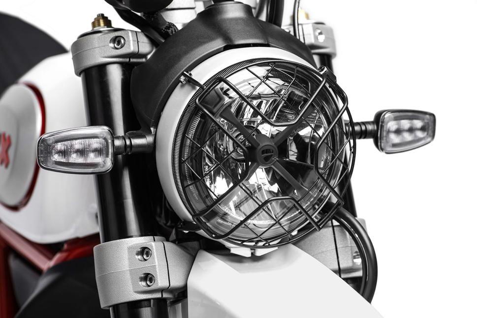 Фара за X-образной решёткой оснащена диодным кольцом ДХО, повышающим видимость в дневное время. Усиленный перекладиной руль невысокий и почти прямой, поэтому руки ездока находятся по бокам от оси рулевой колонки.