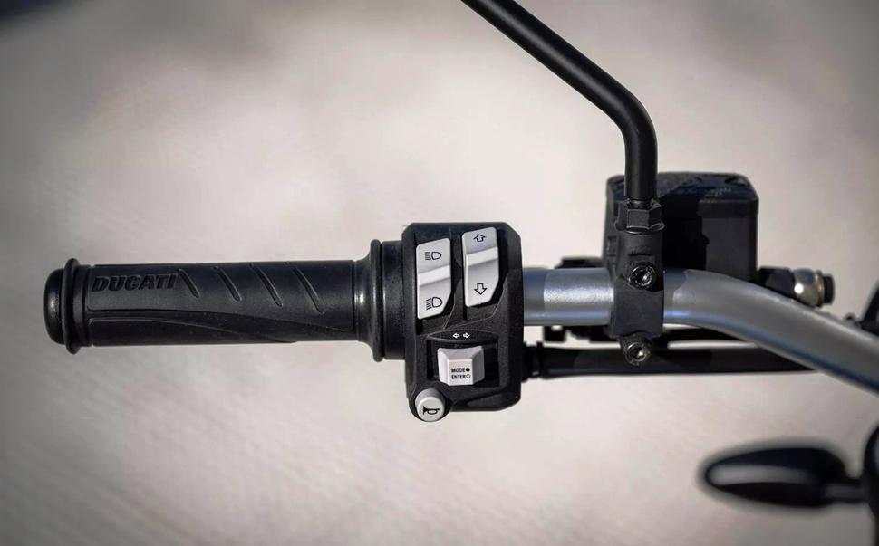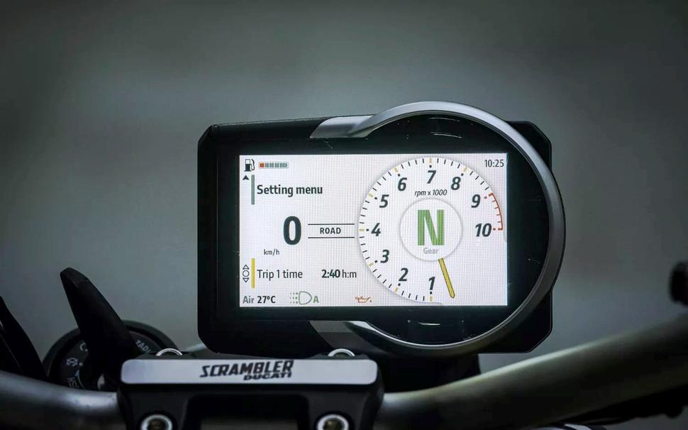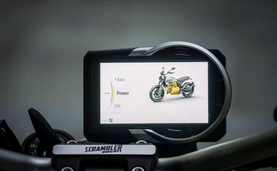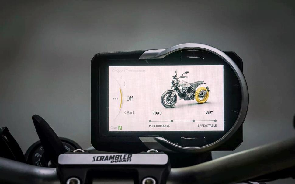 Что касается технологий, то тут Ducati не ограничились уже упомянутым электронным газом. Новая приборная панель на базе 4,3-дюймового TFT-дисплея позволяет переключаться между двумя режимами езды, четырьмя уровнями трекшн-контроля (или выключить его вовсе) и тремя уровнями мощности. Опциональный Bluetooth-модуль позволяет подключить к мотоциклу смартфон. На основе инерциального измерительного блока от Bosch работает наклонная ABS, которую нельзя отключить для внедорожной езды (хотя, казалось бы, Scrambler), но зато она позволит остаться на ходу, даже если хапнуть передний тормоз всей пятернёй в повороте.