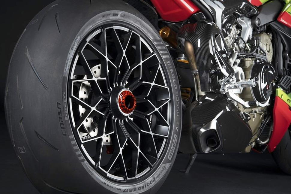 Из других особенностей Streetfighter V4 Lamborghini - карбоновая крышка сухого сцепления, фрезерованные подножки от Rizoma, титаново-карбоновый выхлоп Akrapovic, облегчённые рычаги и много-много других карбоновых мелочей. Также будет доступен трековый комплект, в который войдут заглушки для крепления номерного знака и зеркал, гоночная крышка бензобака и чехол в цвет. Помимо этих особенностей мотоцикл в версии Lamborghini точно такой же, как существующий Streetfighter V4 S, с тем же двигателем Desmosedici Stradale, выдающим 208лс на 13000об/мин. Настройка двигателя, тормозные компоненты, характеристики шасси и так далее остались без изменений.