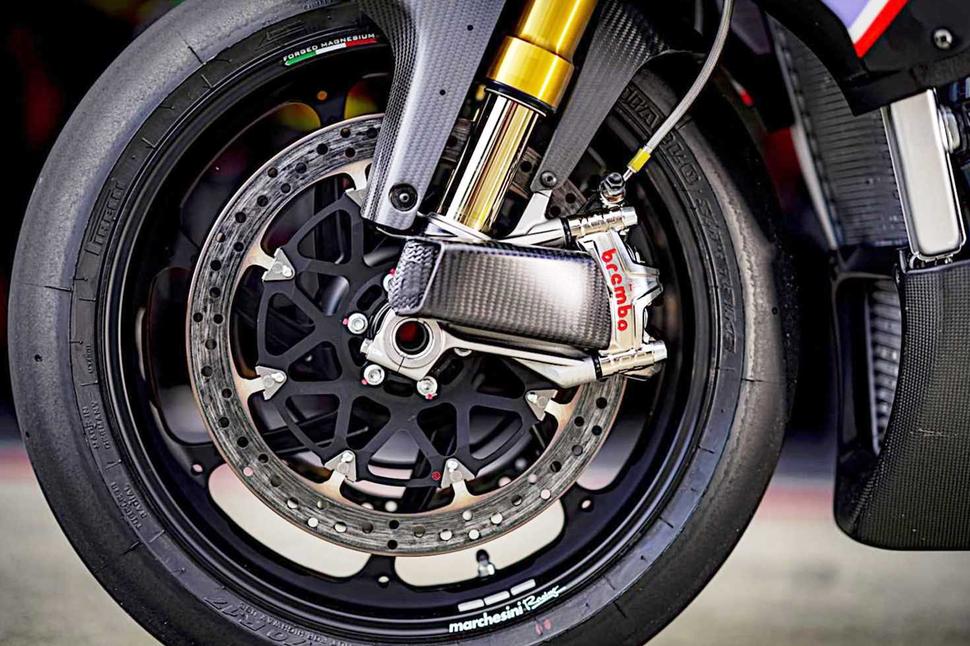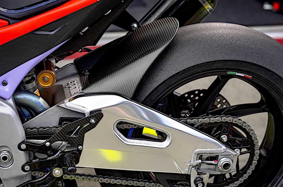 Все мы знаем формулу хорошего мотоцикла, не так ли? Меньше килограммов и больше лошадей… С этой позиции Aprilia даже сохранили прежнюю форму бака, но сделали его легче. Рычаги сцепления и переднего тормоза - фрезерованные алюминиевые, как и элементы защиты картера, регулируемые подножки и пробка бака. Aprilia Tuono V4 X оснащён коваными магниевыми дисками Marchesini, обутыми, само собой, в трековые слики, и полным титановым выхлопом с карбоновой трубой, позволяющим не только снять максимальную мощность, но и при этом хорошо звучать.