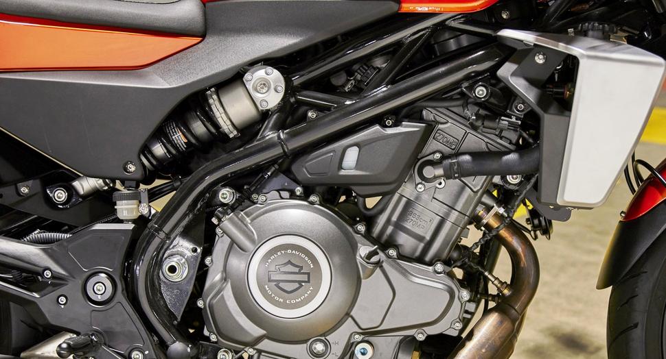 В комплекте с бОльшей кубатурой идёт увеличенное шасси, 50-миллиметровая перевёрнутая вилка, радиальные передние суппорта, тормозные диски бОльшего диаметра и, конечно же, больше металла, как того требует наследие Sportster. Всё это делает X500 более комфортным и дальнобойным, чем шустрый, но откровенно городской X350.