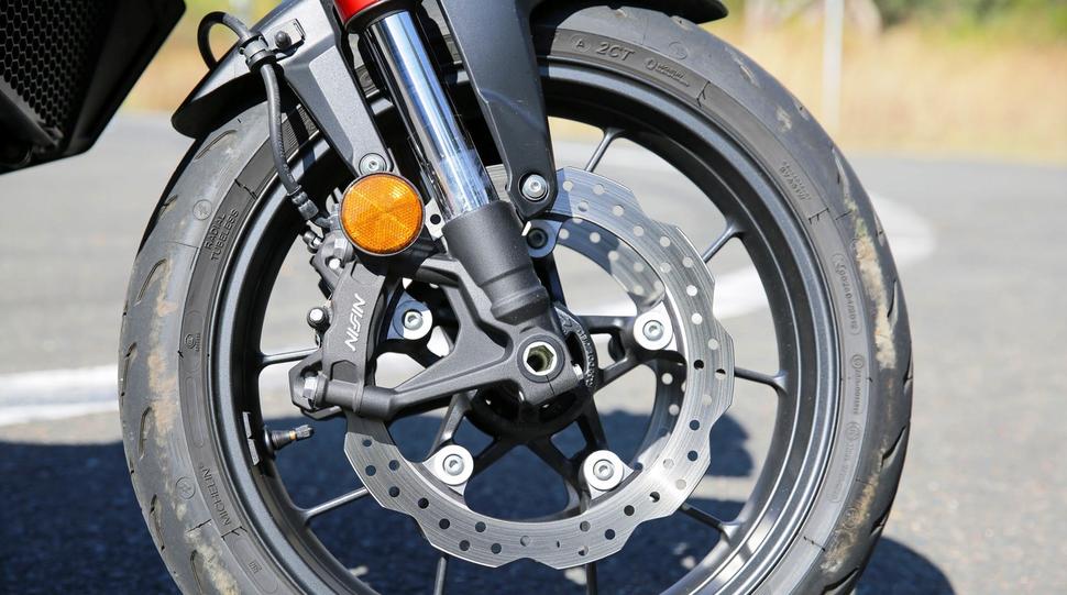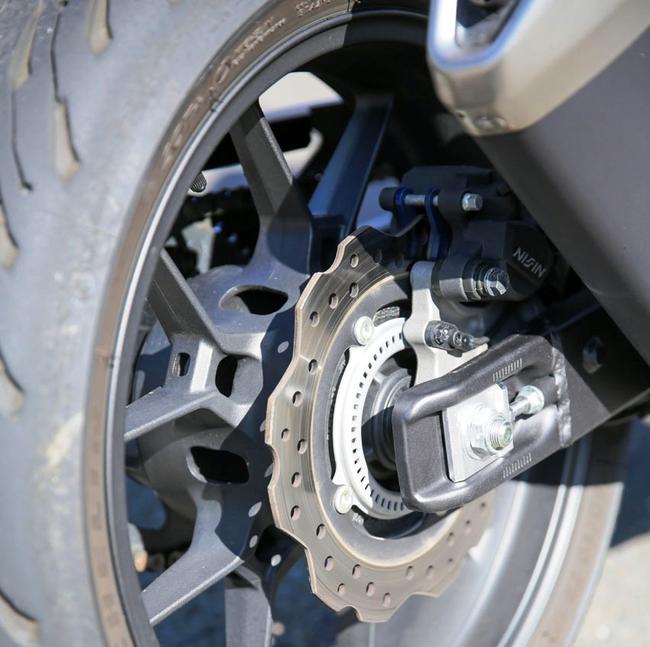 Два 296-миллиметровых передних тормозных диска и один 240-й сзади оснащены ABS. Переднее колесо обуто в резину размером 120/70-17, а заднее - 160/60-17. Колёсная база равна 1420мм, а дорожный просвет составляет 140мм.